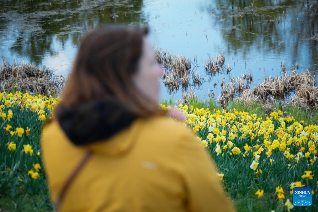 A woman enjoys flowers at a park in Warsaw, Poland, April 22, 2026. (Photo by Jaap Arriens/Xinhua)
