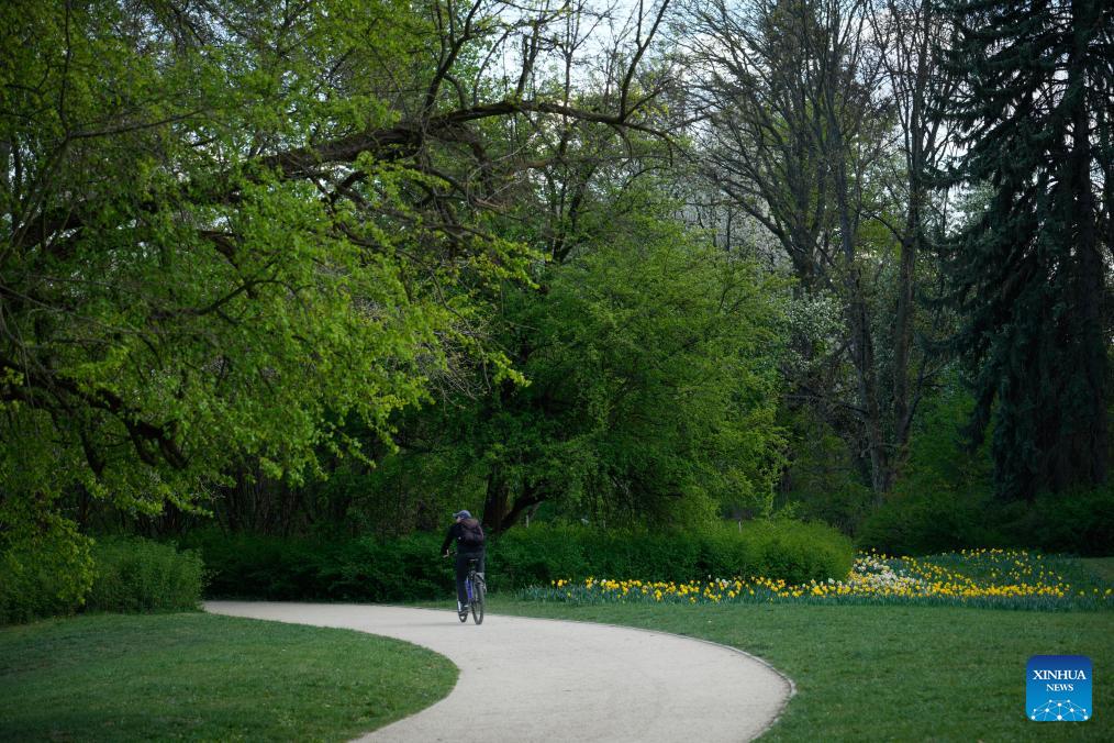 A cyclist rides through a park in Warsaw, Poland, April 22, 2026. (Photo by Jaap Arriens/Xinhua)