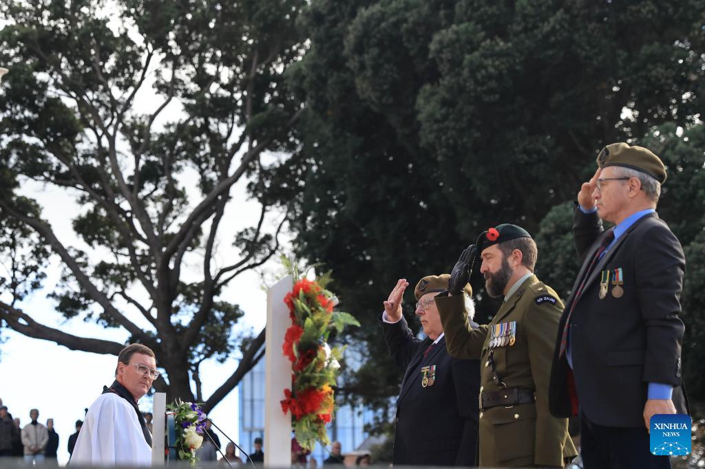 Soldiers salute during the Anzac Day memorial in Wellington, New Zealand, April 25, 2026. Anzac Day, which falls on April 25, marks the anniversary of the first major military action fought by Australian and New Zealand Army Corps (Anzac) in World War I on Turkey's Gallipoli Peninsula in 1915. (Photo by Meng Tao/Xinhua)