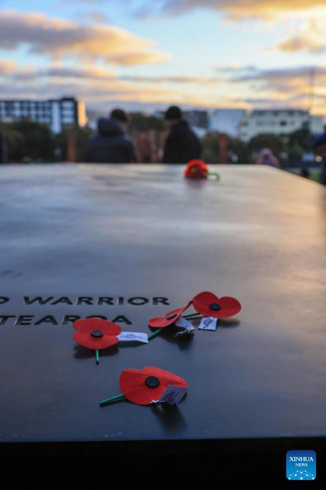 This photo taken on April 25, 2026 shows floral tributes marking the Anzac Day atop a monument in Wellington, New Zealand. Anzac Day, which falls on April 25, marks the anniversary of the first major military action fought by Australian and New Zealand Army Corps (Anzac) in World War I on Turkey's Gallipoli Peninsula in 1915. (Photo by Meng Tao/Xinhua)