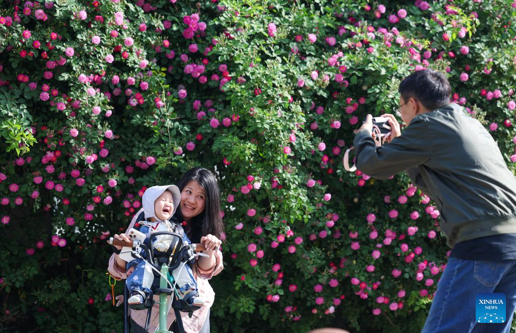 People take photos in front of flowers in Shijiazhuang, north China's Hebei Province, April 24, 2026. (Photo by Liang Zidong/Xinhua)