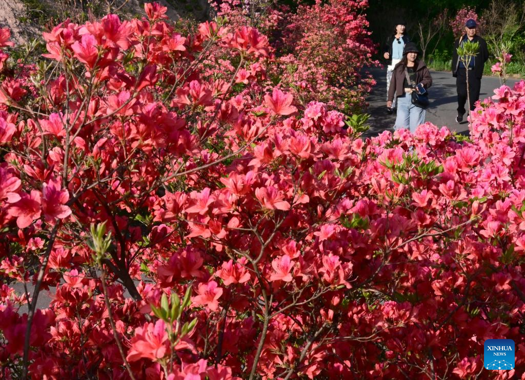 A tourist takes photos of flowers at a scenic spot in Ruyang County, central China's Henan Province, April 25, 2026. (Photo by Kang Hongjun/Xinhua)