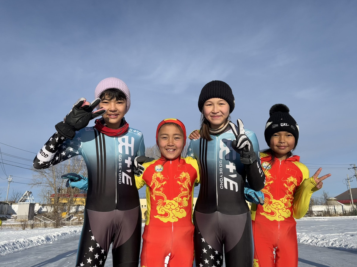 Members of the speed skating team of Shuixigou Middle School strike a playful pose for the camera on December 20, 2023. (Photo: Zhu Jinyi)