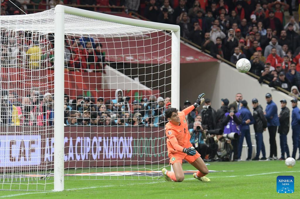 Morocco's goalkeeper Yassine Bounou makes a save during the Africa Cup of Nations semifinal match between Morocco and Nigeria in Rabat, Morocco, Jan. 14, 2026. (Photo by Aissa/Xinhua)