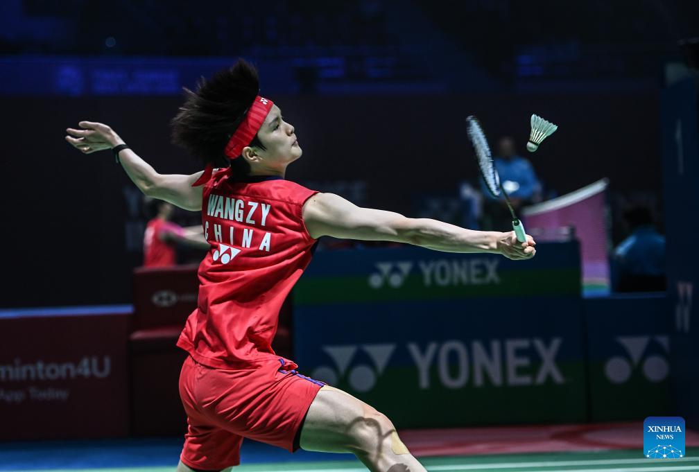 Nidaira Natsuki of Japan competes against Wang Zhiyi of China during women's singles quarter-final match at the India Open 2026 in New Delhi, India, Jan. 16, 2026. (Xinhua/Javed Dar)