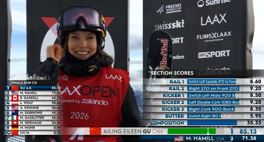The Laax final featured only two runs for each athlete, with the best score counting toward the final standings. Gu secured victory with 85.13 points from her first run, which stood as the highest score of the day. Marin Hamill from U.S. finished second with 71.38 points, while Austria's Lara Wolf took bronze with 67.85.