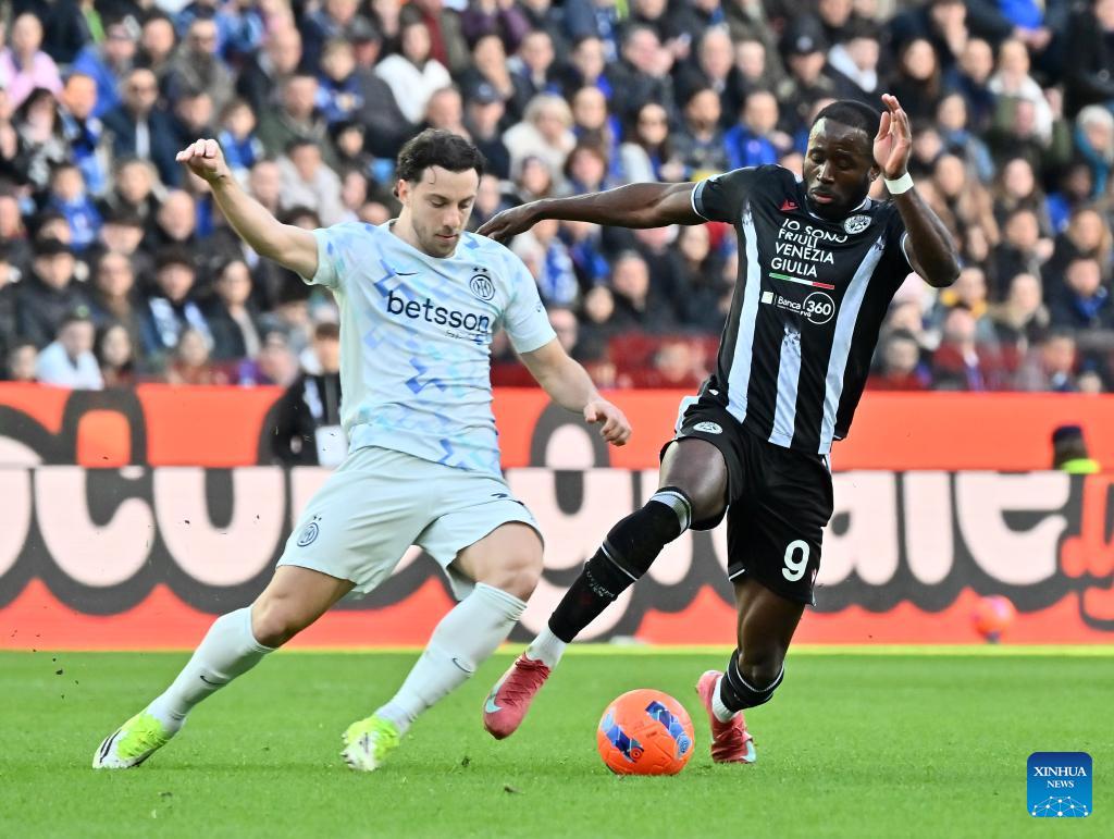 Inter Milan's Pio Esposito (C) vies with Udinese's Christian Kabasele (L) during a Serie A football match between Udinese and Inter Milan in Udine, Italy, Jan.17, 2026. (Photo by Diego Petrussi/Xinhua)