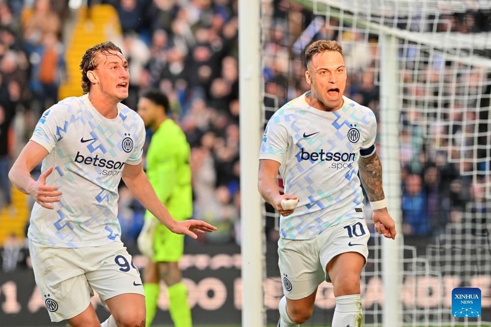 Inter Milan's Lautaro Martinez (2nd L) celebrates his goal with his teammate Pio Espositob (1st L) during a Serie A football match between Udinese and Inter Milan in Udine, Italy, Jan.17, 2026. (Photo by Diego Petrussi/Xinhua)