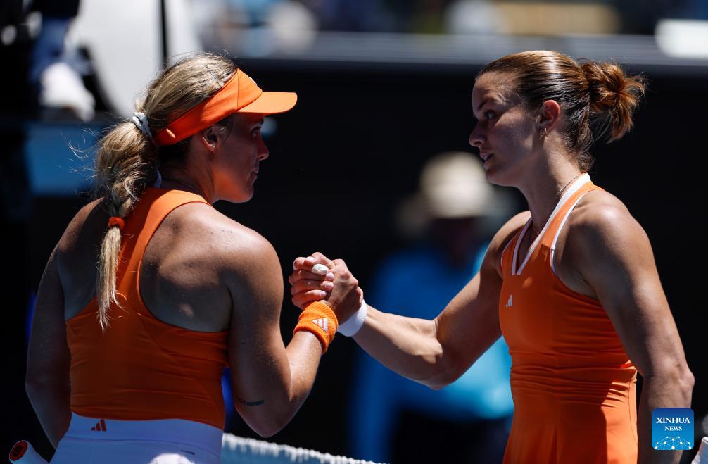 Maria Sakkari of Greece (R) and Leolia Jeanjean of France shake hands after their women's singles 1st round match at Australian Open tennis tournament in Melbourne, Australia, Jan. 18, 2026. (Xinhua/Ma Ping)