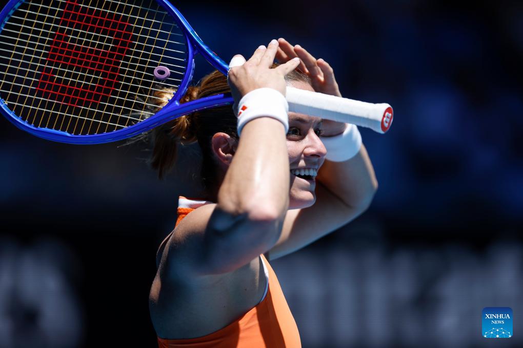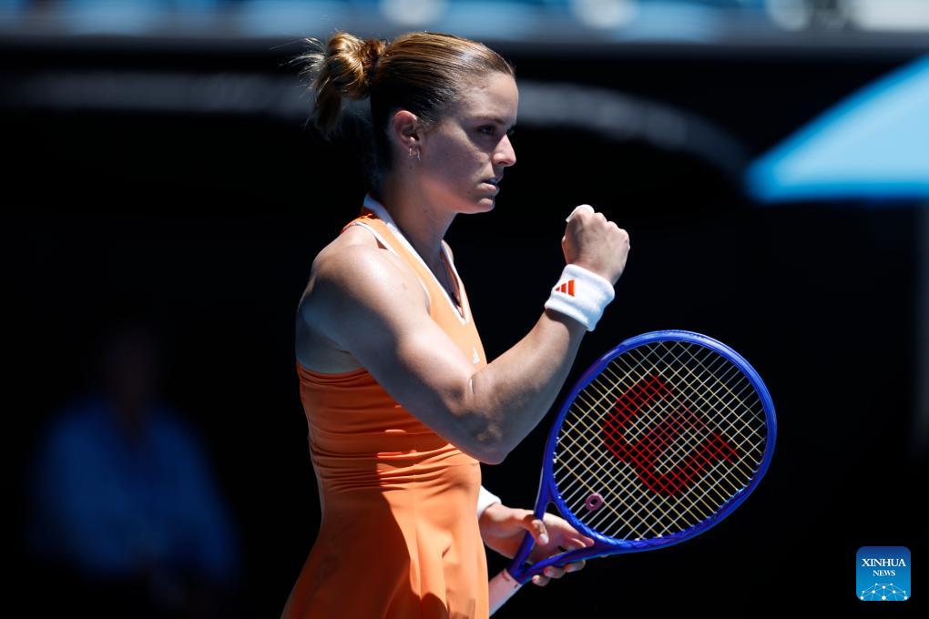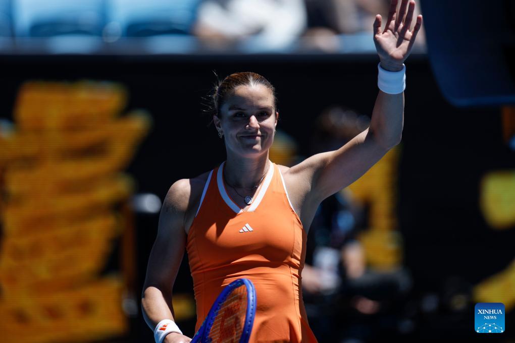 Maria Sakkari of Greece celebrates winning the women's singles 1st round match between Maria Sakkari of Greece and Leolia Jeanjean of France at Australian Open tennis tournament in Melbourne, Australia, Jan. 18, 2026. (Xinhua/Ma Ping)