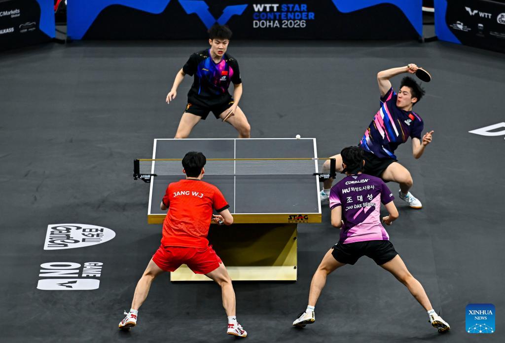 Huang Youzheng (top L)/Wen Ruibo (top R) of China compete during the men's doubles final match against Jang Woojin/Cho Daeseong of South Korea at WTT Star Contender Doha 2026 in Doha, Qatar, Jan. 17, 2026. (Photo by Nikku/Xinhua)