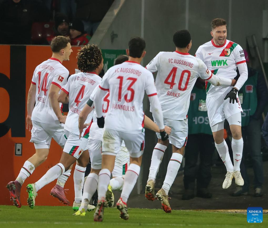 Elvis Rexhbecaj (1st R) of FC Augsburg celebrates scoring with his teammates during the German first division Bundesliga football match between FC Augsburg and SC Freiburg in Augsburg, Germany, Jan. 18, 2026. (Photo by Philippe Ruiz/Xinhua)