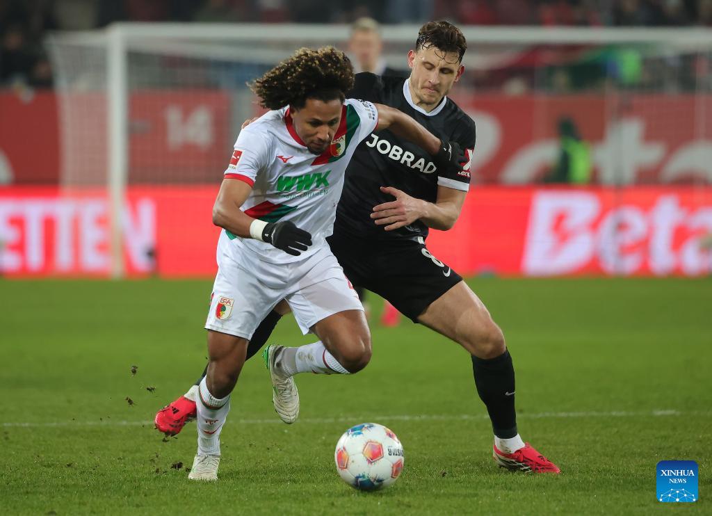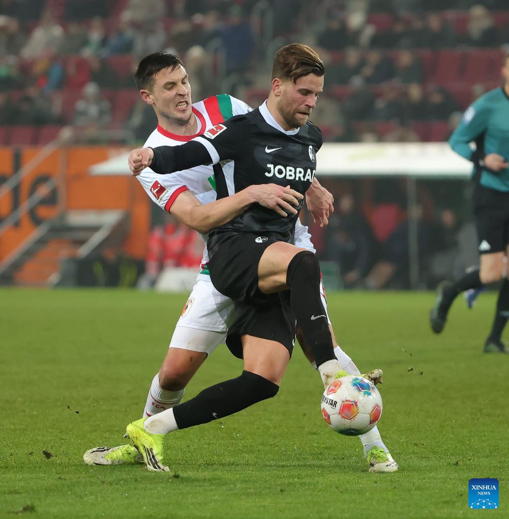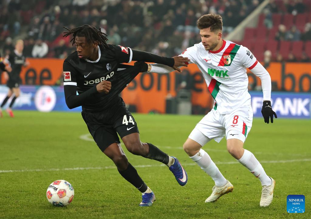 Robin Fellhauer (L) of FC Augsburg vies with Bruno Ogbus of SC Freiburg during the German first division Bundesliga football match between FC Augsburg and SC Freiburg in Augsburg, Germany, Jan. 18, 2026. (Photo by Philippe Ruiz/Xinhua)
