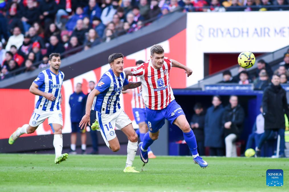 Atletico de Madrid's Julian Alvarez (R) vies with Deportivo Alaves's Jon Pacheco during La Liga football match between Atletico de Madrid and Deportivo Alaves in Madrid, Spain, on Jan. 18, 2026. (Photo by Gustavo Valiente/Xinhua)