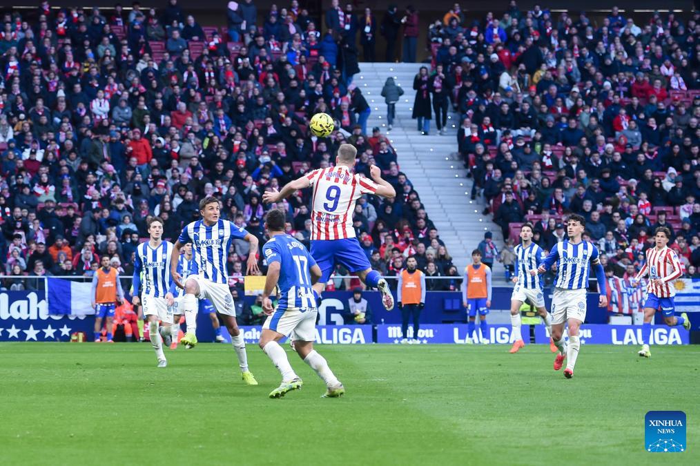 Atletico de Madrid's Alexander Sorloth (top) heads the ball to score during La Liga football match between Atletico de Madrid and Deportivo Alaves in Madrid, Spain, on Jan. 18, 2026. (Photo by Gustavo Valiente/Xinhua)