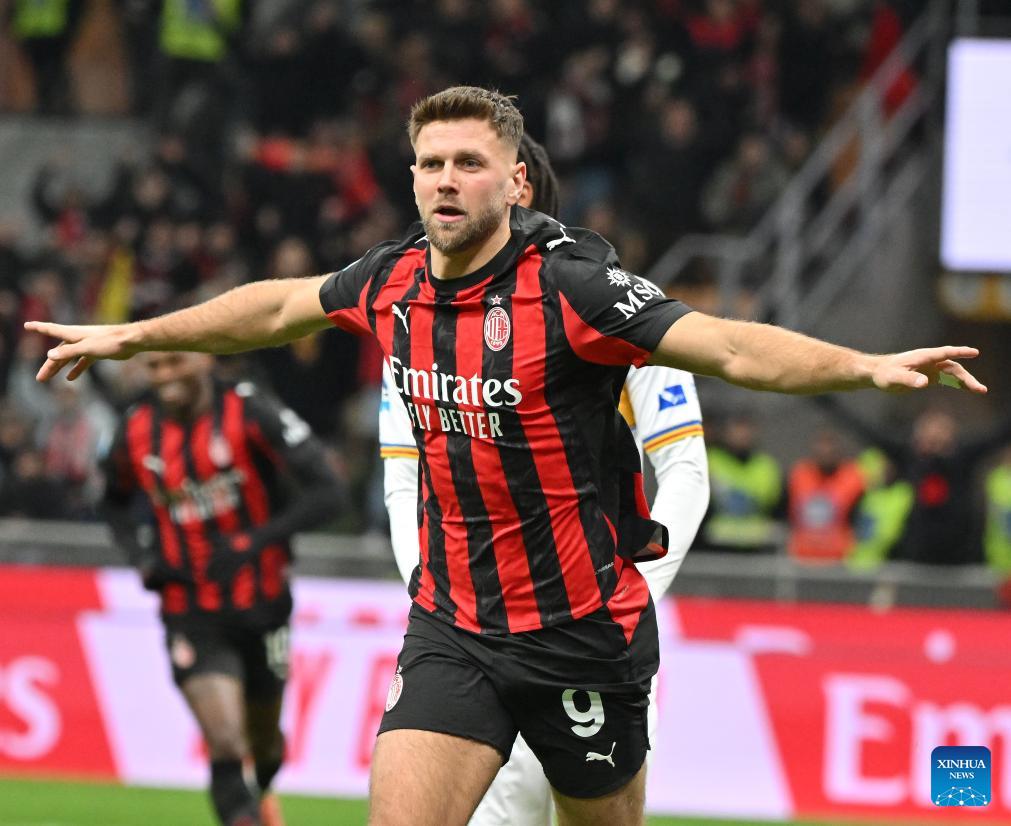AC Milan's Niclas Fullkrug celebrates his goal during a Serie A football match between AC Milan and Lecce in Milan, Italy, Jan. 18, 2026. (Photo by Alberto Lingria/Xinhua)