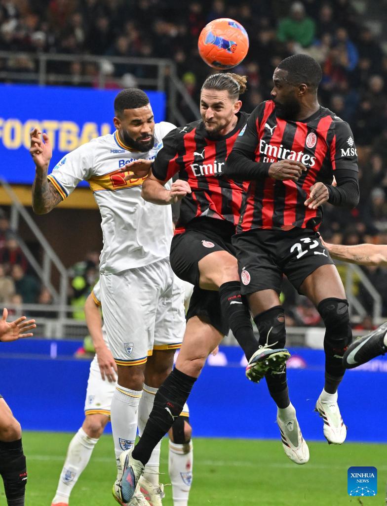AC Milan's Fikayo Tomori (R) and Adria Rabiot (C) vie for a header with Lecce's Jamil Siebert during a Serie A football match between AC Milan and Lecce in Milan, Italy, Jan. 18, 2026. (Photo by Alberto Lingria/Xinhua)