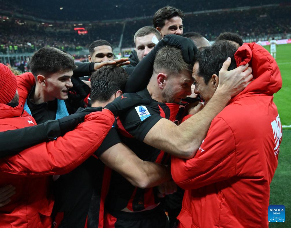 AC Milan's Niclas Fullkrug (2nd R) celebrates his goal with his teammate during a Serie A football match between AC Milan and Lecce in Milan, Italy, Jan. 18, 2026. (Photo by Alberto Lingria/Xinhua)