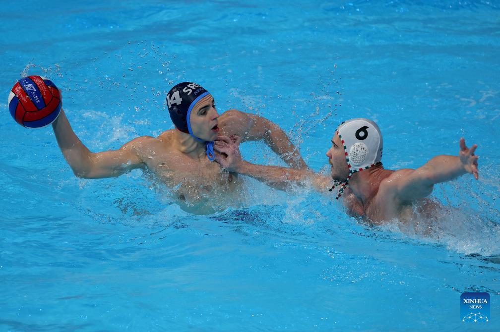 Serbia's Vasilije Martinovic (L) vies with Hungary's Adam Nagy during the group stage II group E match between Hungary and Serbia at the Men's European Water Polo Championships in Belgrade, Serbia, Jan. 18, 2026. (Photo by Predrag Milosavljevic/Xinhua)