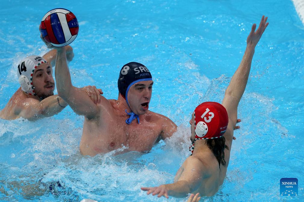 Serbia's Nikola Jaksic (C) vies with Hungary's Zsombor Vismeg (L) and goalkeeper Soma Vogel during the group stage II group E match between Hungary and Serbia at the Men's European Water Polo Championships in Belgrade, Serbia, Jan. 18, 2026. (Photo by Predrag Milosavljevic/Xinhua)