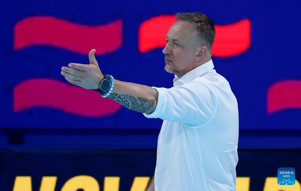 Hungary's head coach Zsolt Varga gestures during the group stage II group E match between Hungary and Serbia at the Men's European Water Polo Championships in Belgrade, Serbia, Jan. 18, 2026. (Photo by Predrag Milosavljevic/Xinhua)