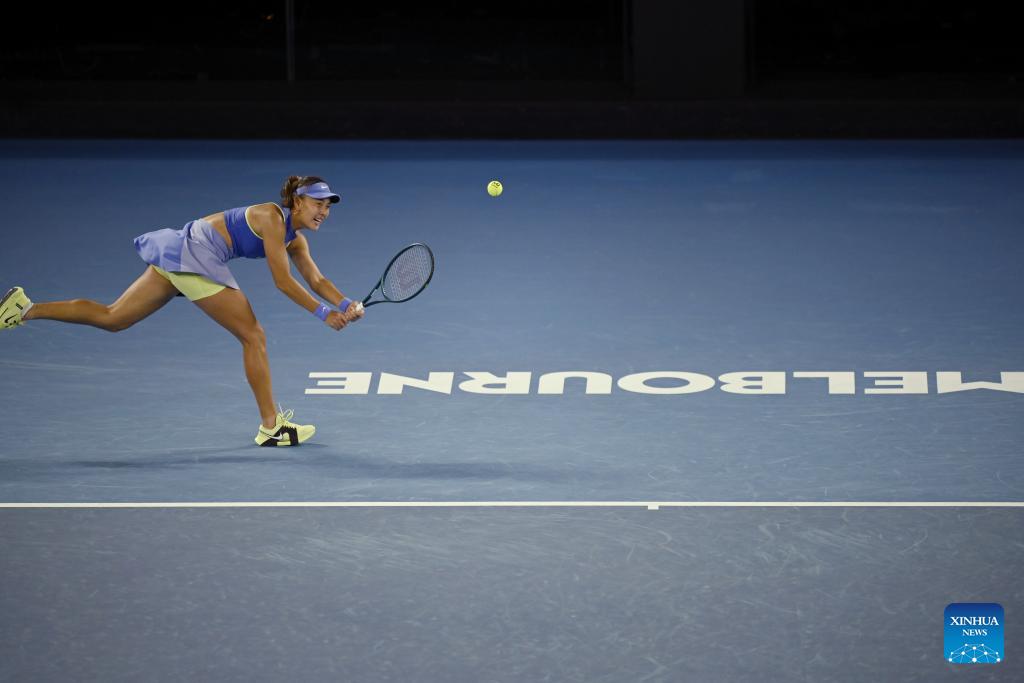 Yuan Yue hits a return during the women's singles 1st round match between Yuan Yue of China and Iga Swiatek of Poland at the Australian Open tennis tournament in Melbourne, Australia, Jan. 19, 2026. (Photo: Xinhua)