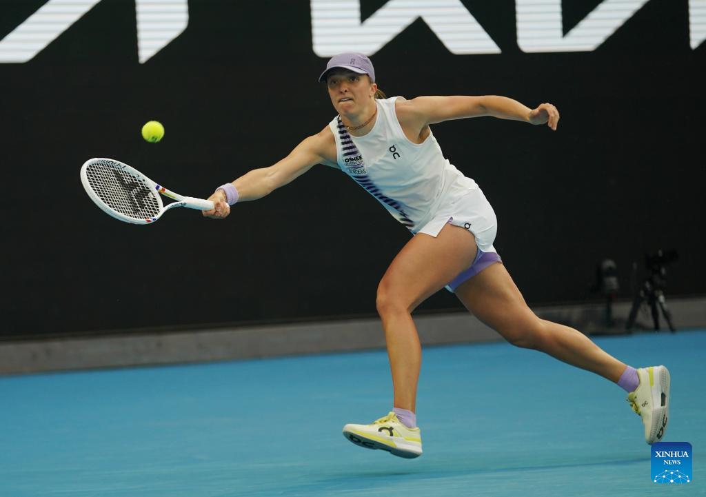 Iga Swiatek hits a return during the women's singles 1st round match between Yuan Yue of China and Iga Swiatek of Poland at the Australian Open tennis tournament in Melbourne, Australia, Jan. 19, 2026. (Photo by Wang Shen/Xinhua)