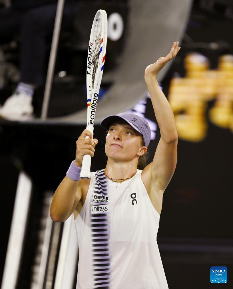 Iga Swiatek reacts after the women's singles 1st round match between Yuan Yue of China and Iga Swiatek of Poland at the Australian Open tennis tournament in Melbourne, Australia, Jan. 19, 2026. (Photo by Wang Shen/Xinhua)