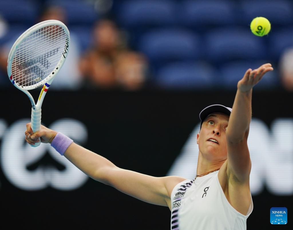 Iga Swiatek serves during the women's singles 1st round match between Yuan Yue of China and Iga Swiatek of Poland at the Australian Open tennis tournament in Melbourne, Australia, Jan. 19, 2026. (Photo by Wang Shen/Xinhua)