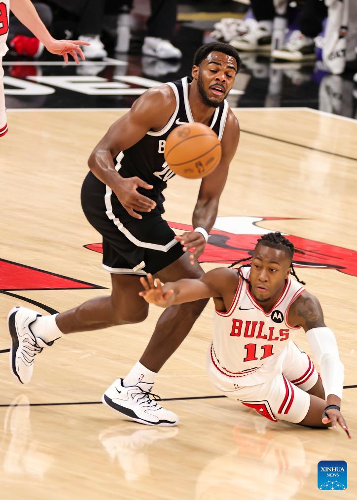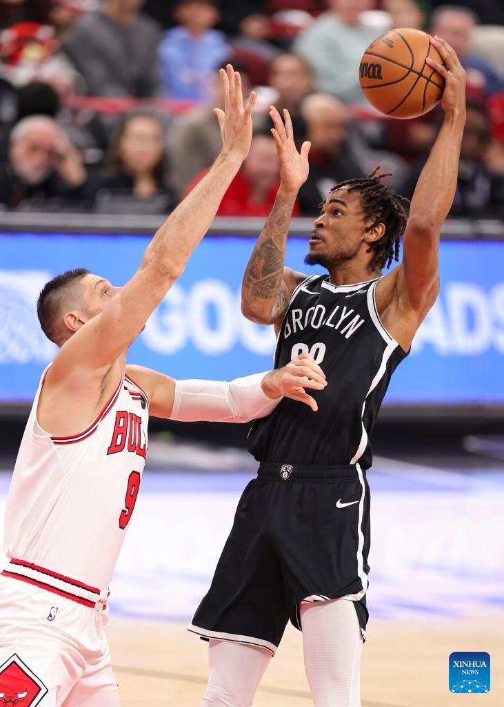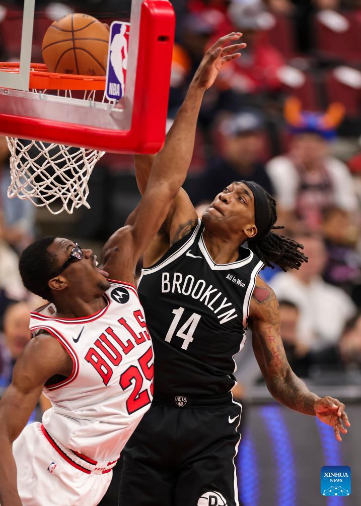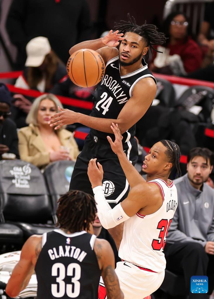 Brooklyn Nets' Nic Claxton (R) competes during the 2025-2026 NBA regular season basketball game between Brooklyn Nets and Chicago Bulls at United Center in Chicago, the United States, Jan. 18, 2026. (Photo by Joel Lerner/Xinhua)