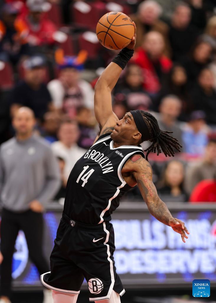 Brooklyn Nets' Terance Mann (R) dunks during the 2025-2026 NBA regular season basketball game between Brooklyn Nets and Chicago Bulls at United Center in Chicago, the United States, Jan. 18, 2026. (Photo by Joel Lerner/Xinhua)