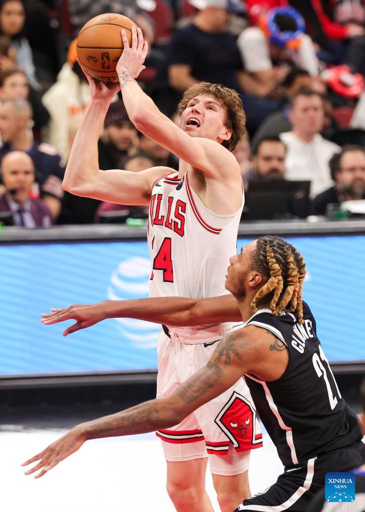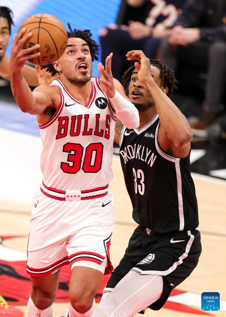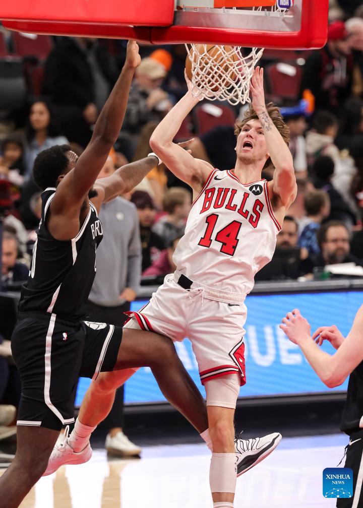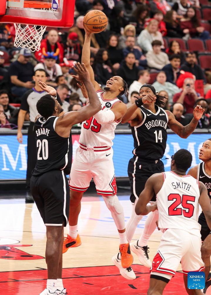 Chicago Bulls' Matas Buzelis (R) drives to the basket during the 2025-2026 NBA regular season basketball game between Brooklyn Nets and Chicago Bulls at United Center in Chicago, the United States, Jan. 18, 2026. (Photo by Joel Lerner/Xinhua)