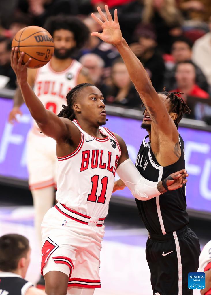 Chicago Bulls' Ayo Dosunmu (L) goes to the basket during the 2025-2026 NBA regular season basketball game between Brooklyn Nets and Chicago Bulls at United Center in Chicago, the United States, Jan. 18, 2026. (Photo by Joel Lerner/Xinhua)