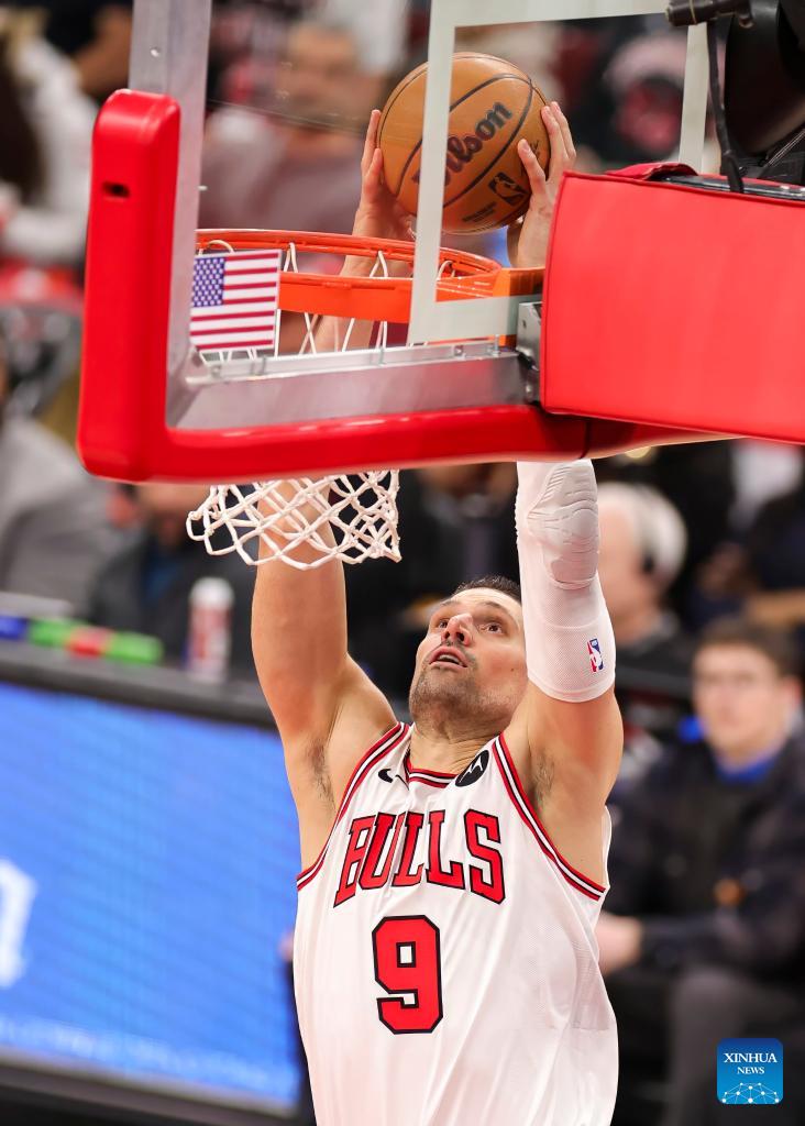 Chicago Bulls' Nikola Vucevic dunks during the 2025-2026 NBA regular season basketball game between Brooklyn Nets and Chicago Bulls at United Center in Chicago, the United States, Jan. 18, 2026. (Photo by Joel Lerner/Xinhua)