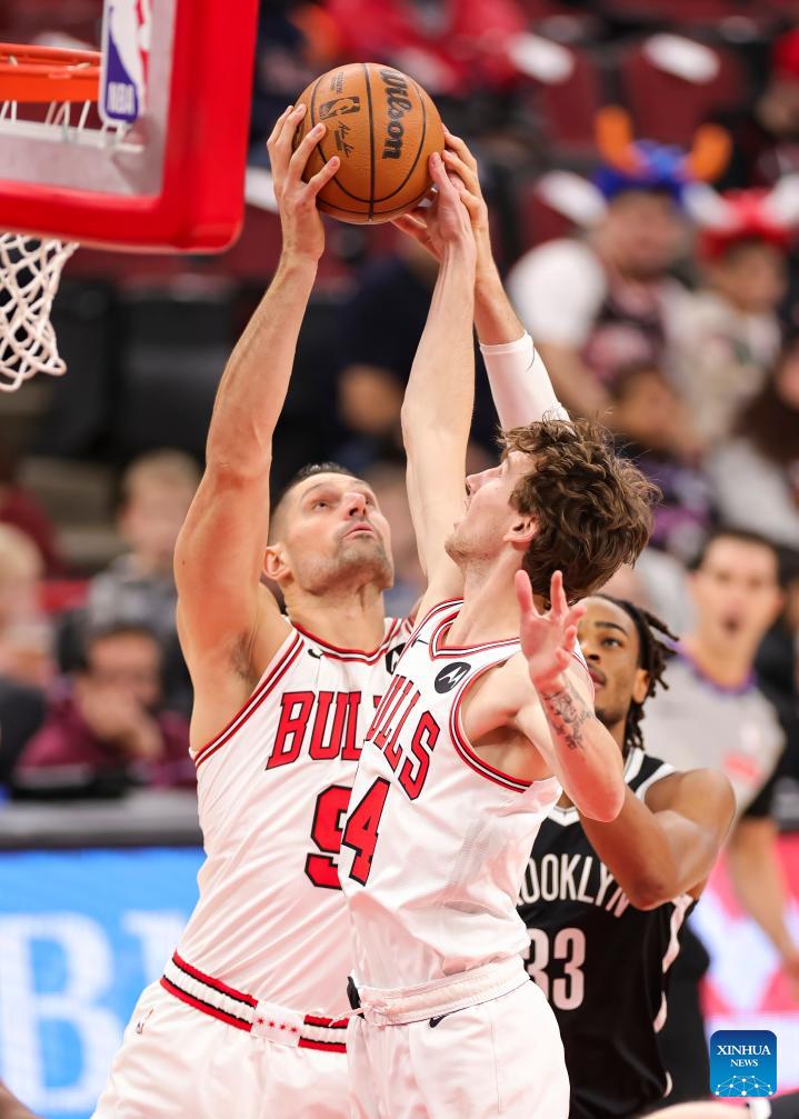 Chicago Bulls' Nikola Vucevic (L) and Matas Buzelis (C) compete during the 2025-2026 NBA regular season basketball game between Brooklyn Nets and Chicago Bulls at United Center in Chicago, the United States, Jan. 18, 2026. (Photo by Joel Lerner/Xinhua)