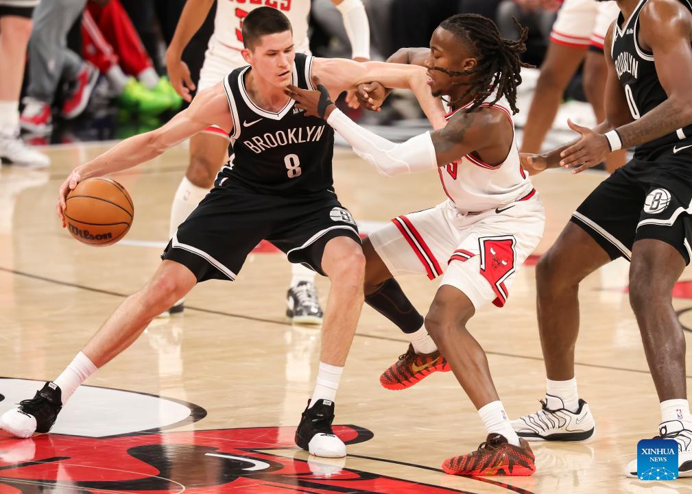Brooklyn Nets' Egor Demin (L) vies with Chicago Bulls' Ayo Dosunmu during the 2025-2026 NBA regular season basketball game between Brooklyn Nets and Chicago Bulls at United Center in Chicago, the United States, Jan. 18, 2026. (Photo by Joel Lerner/Xinhua)