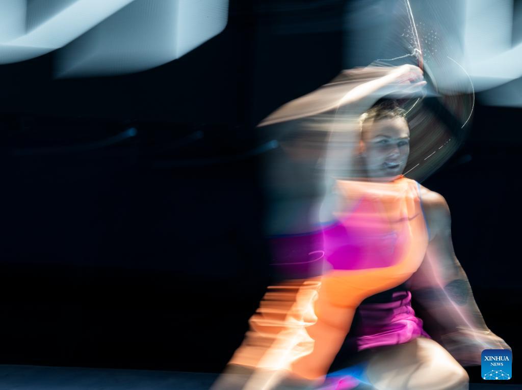 Aryna Sabalenka of Belarus hits a return during the women's singles 2nd round match against Bai Zhuoxuan of China at the Australian Open tennis tournament in Melbourne, Australia, Jan. 21, 2026. (Xinhua/Ma Ping)