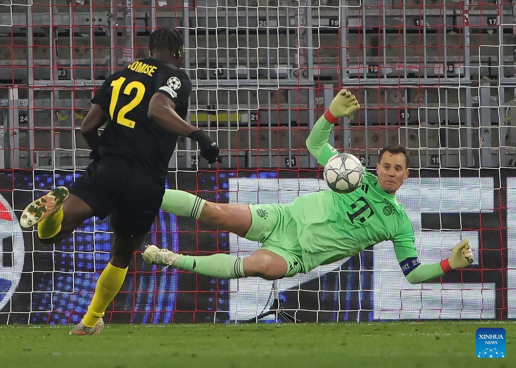 Manuel Neuer (R), goalkeeper of Bayern Munich, makes a save during the UEFA Champions League match between Bayern Munich and Union Saint-Gilloise in Munich, Germany, Jan. 21, 2026. (Photo by Philippe Ruiz/Xinhua)