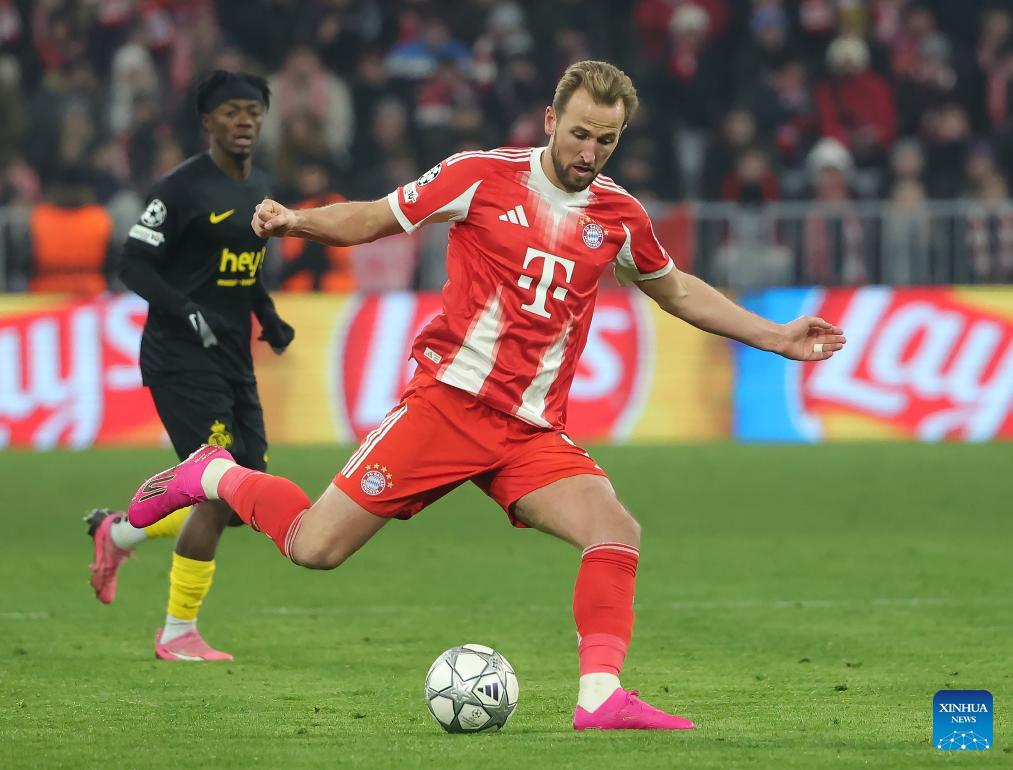 Harry Kane (front) of Bayern Munich kicks the ball during the UEFA Champions League match between Bayern Munich and Union Saint-Gilloise in Munich, Germany, Jan. 21, 2026. (Photo by Philippe Ruiz/Xinhua)