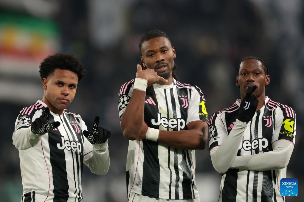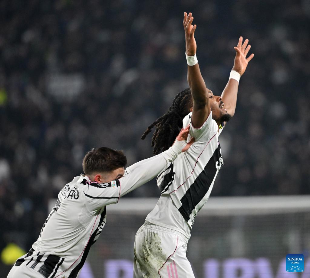 Juventus' Khephren Thuram (R) celebrates his goal with teammates during the UEFA Champions League match between Juventus and Benfica in Turin, Italy, Jan. 21, 2026. (Photo by Diego Petrussi/Xinhua)