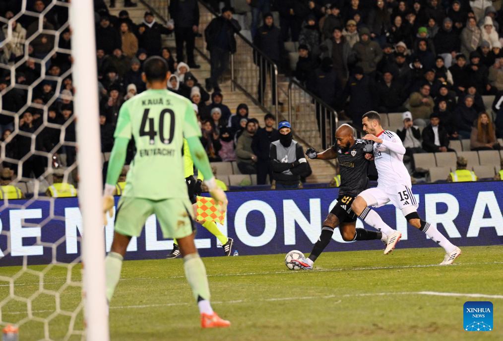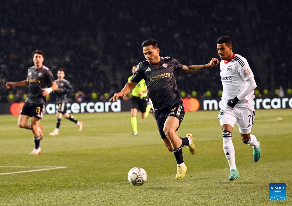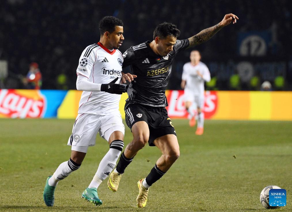 Qarabag's Matheus Silva (R) vies with Frankfurt's Ansgar Knauff during the UEFA Champions League match between Qarabag and Frankfurt at the Tofiq Bahramov Republican Stadium in Baku, Azerbaijan, Jan. 21, 2026. (Photo by Tofik Babayev/Xinhua)