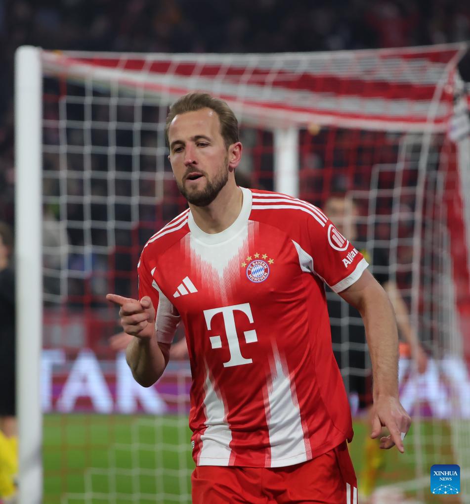 Harry Kane of Bayern Munich celebrates scoring during the UEFA Champions League match between Bayern Munich and Union Saint-Gilloise in Munich, Germany, Jan. 21, 2026. (Photo by Philippe Ruiz/Xinhua)