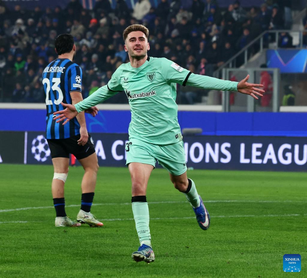 Athletic Club's Robert Navarro celebrates his goal during the UEFA Champions League match between Atalanta and Athletic Club in Bergamo, Italy, Jan. 21, 2026. (Xinhua)