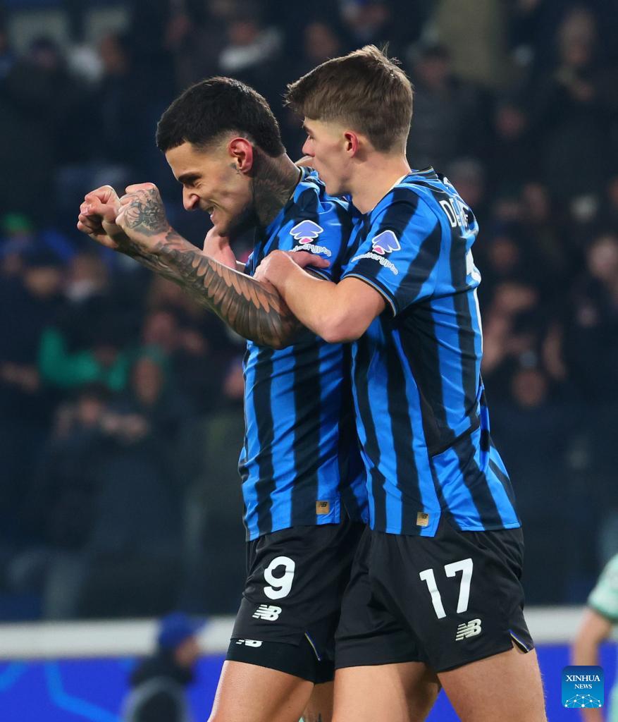 Atalanta's Gianluca Scamacca (L) celebrates his goal with teammate Charles De Katelaere during the UEFA Champions League match between Atalanta and Athletic Club in Bergamo, Italy, Jan. 21, 2026. (Xinhua)