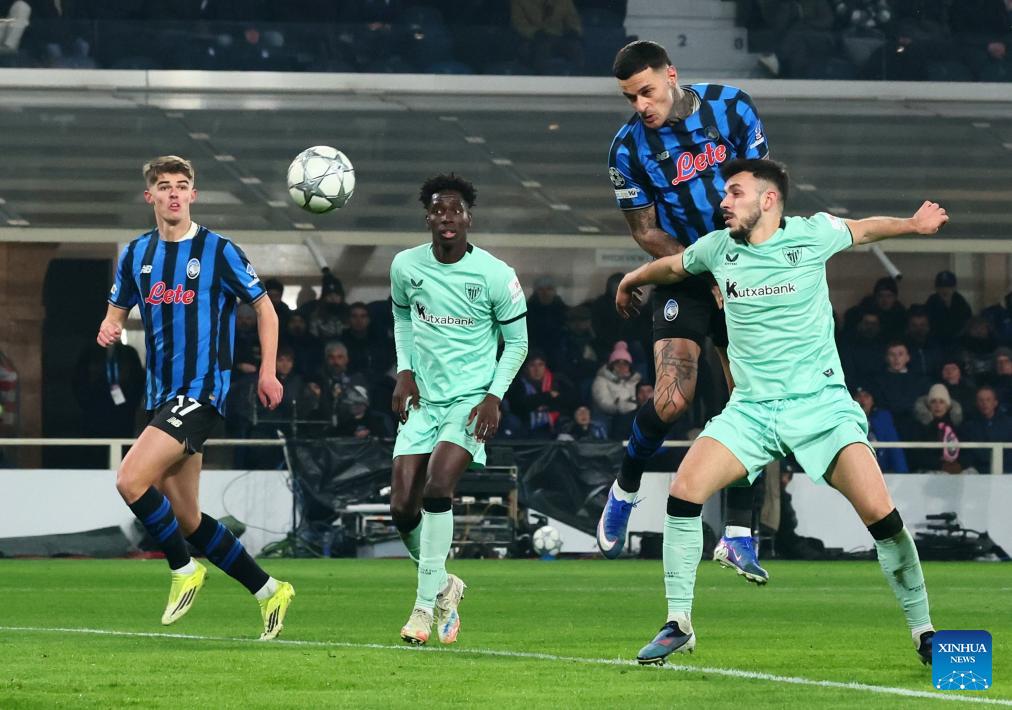 Atalanta's Gianluca Scamacca (top) heads the ball to score during the UEFA Champions League match between Atalanta and Athletic Club in Bergamo, Italy, Jan. 21, 2026. (Xinhua)