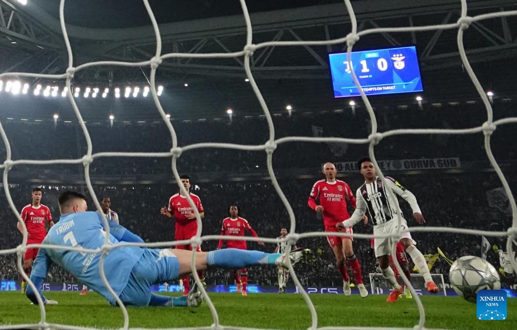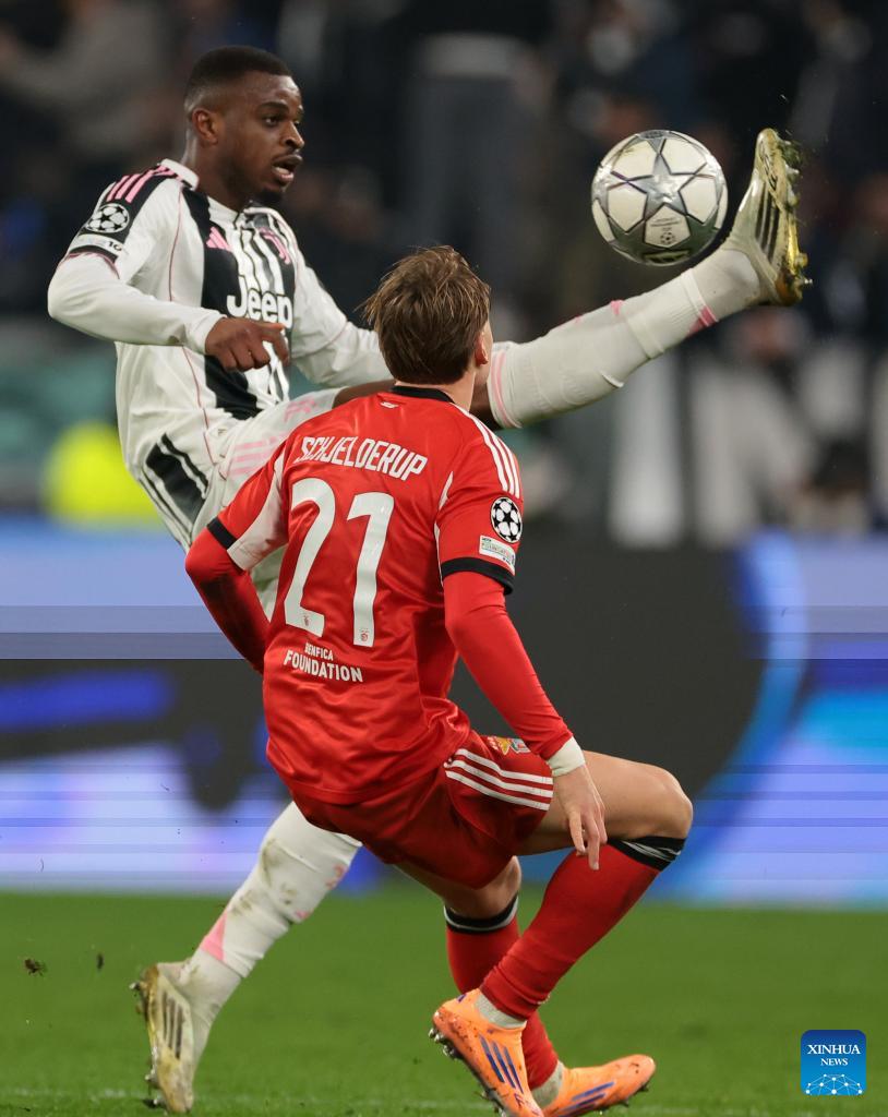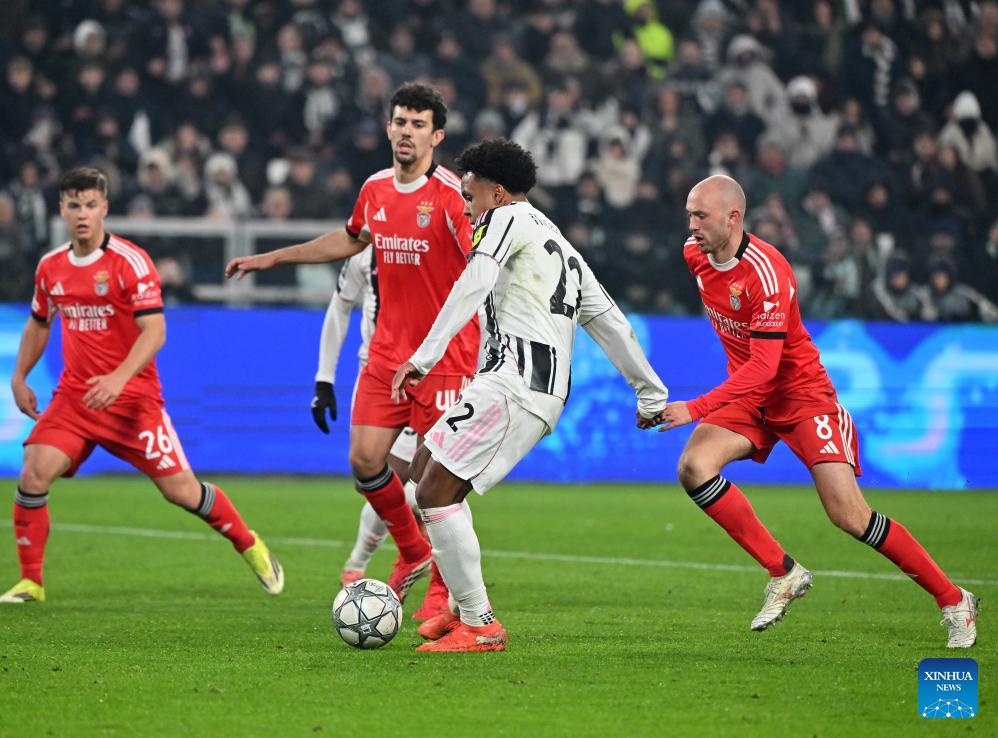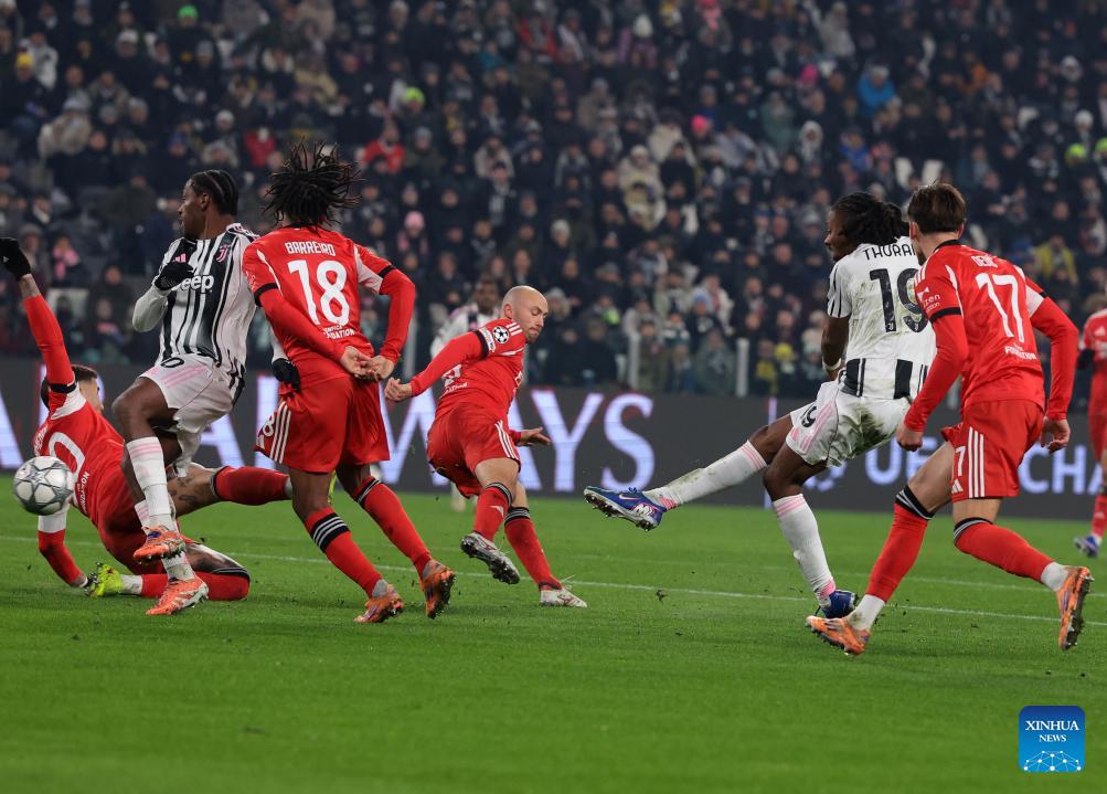 Juventus' Khephren Thuram (2nd R) shoots to score during the UEFA Champions League match between Juventus and Benfica in Turin, Italy, Jan. 21, 2026. (Photo by Diego Petrussi/Xinhua)