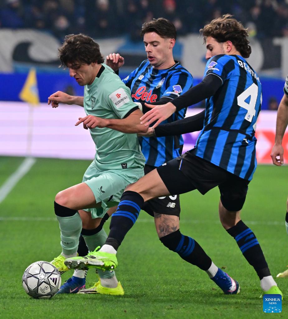 Athletic Club's Unai Gomez (L) vies with Atalanta's Lorenzo Bernasconi (R) and Nicola Zalewski during the UEFA Champions League match between Atalanta and Athletic Club in Bergamo, Italy, Jan. 21, 2026. (Xinhua)