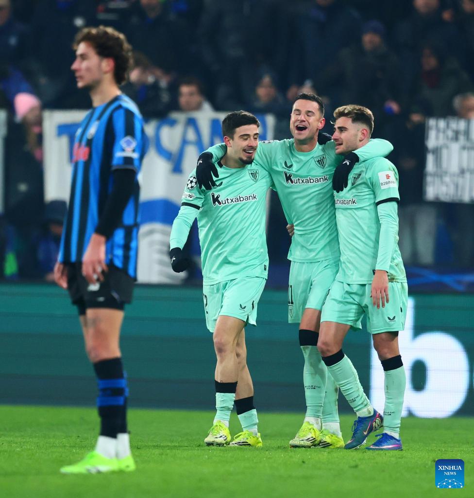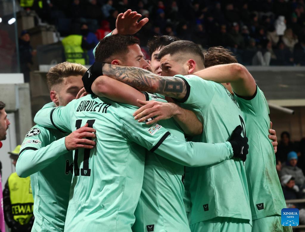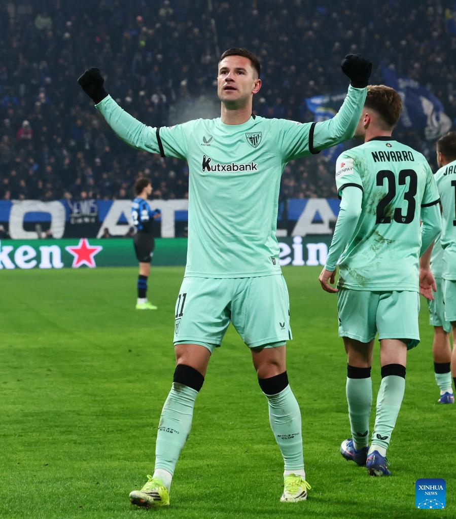Athletic Club's Gorka Guruzeta (2nd L) celebrates his goal with teammates during the UEFA Champions League match between Atalanta and Athletic Club in Bergamo, Italy, Jan. 21, 2026. (Xinhua)