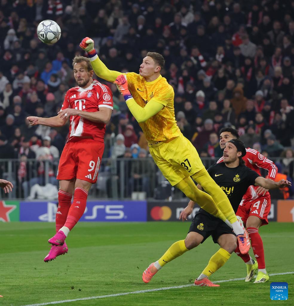 Kjell Scherpen (top R), goalkeeper of Union Saint-Gilloise, makes a save against Harry Kane of Bayern Munich during the UEFA Champions League match between Bayern Munich and Union Saint-Gilloise in Munich, Germany, Jan. 21, 2026. (Photo by Philippe Ruiz/Xinhua)