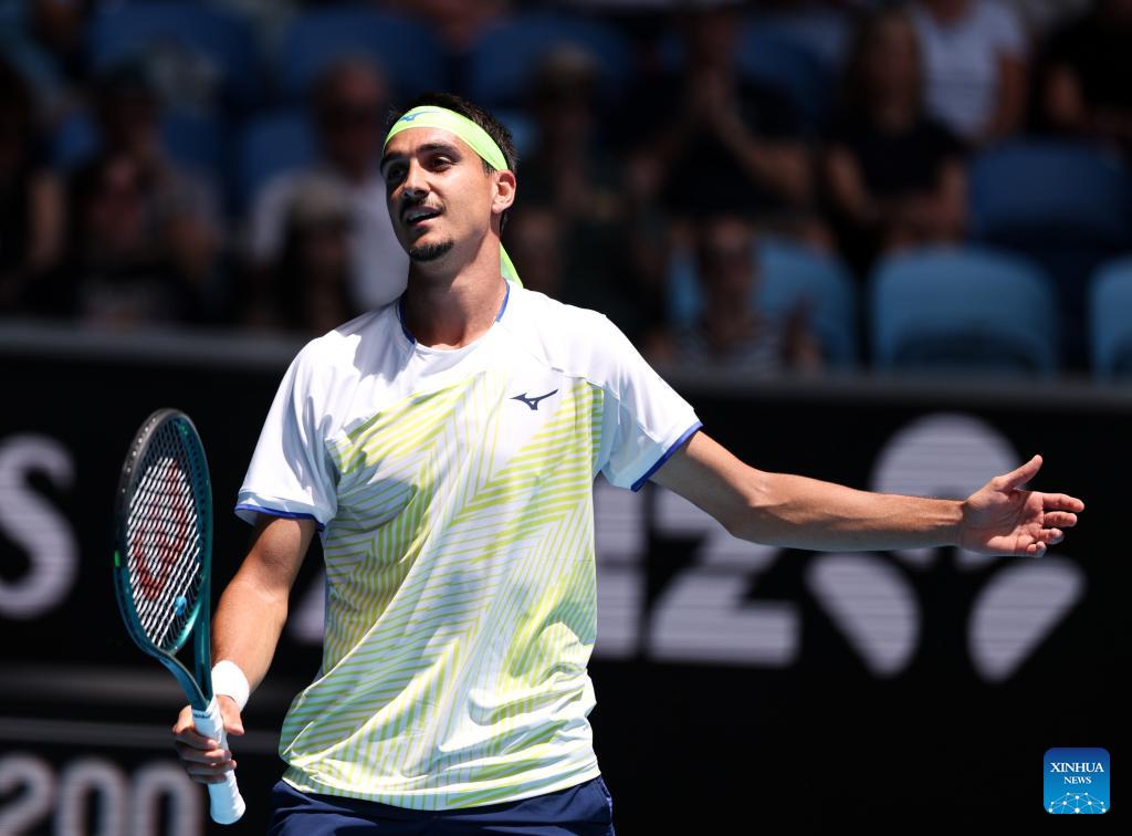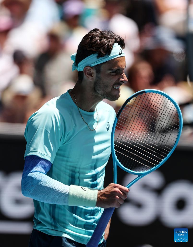 Lorenzo Musetti of Italy reacts during the men's singles 2nd round match against Lorenzo Sonego of Italy at the Australian Open tennis tournament in Melbourne, Australia, Jan. 22, 2026. (Xinhua/Ma Ping)
